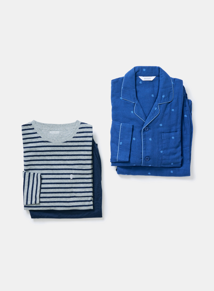 チャーミングなゴーストをジャカード織りで表現した新作には、優しい肌触りが特徴の三重ガーゼ生地を採用。プレーンなボーダー柄と無地のパンツを組み合わせた一着には、しなやかで丈夫な天竺素材を採用。真冬以外着用できる適度な厚さが魅力です。